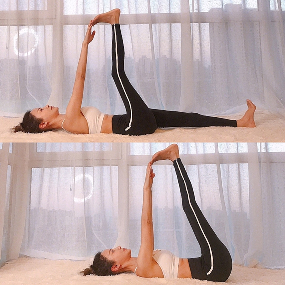 也是一個可以伸展大腿和小腿後側的伸展動作,平躺在地,將腿向上抬起成90度伸直,用手將腳尖向下、往身體方向勾起,一邊約30秒充分伸展腿肌,這個動作除了伸展之外、也可以幫助腿型變直。