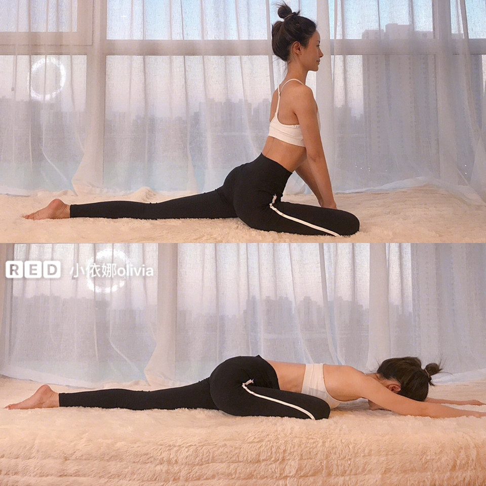 想加強效果、或是柔軟性較好的人,也可以在原有的基礎上再俯身往前,將後側的腿腳尖繃直,大腿前側會有更有強烈伸展感,一邊停留20秒即可。