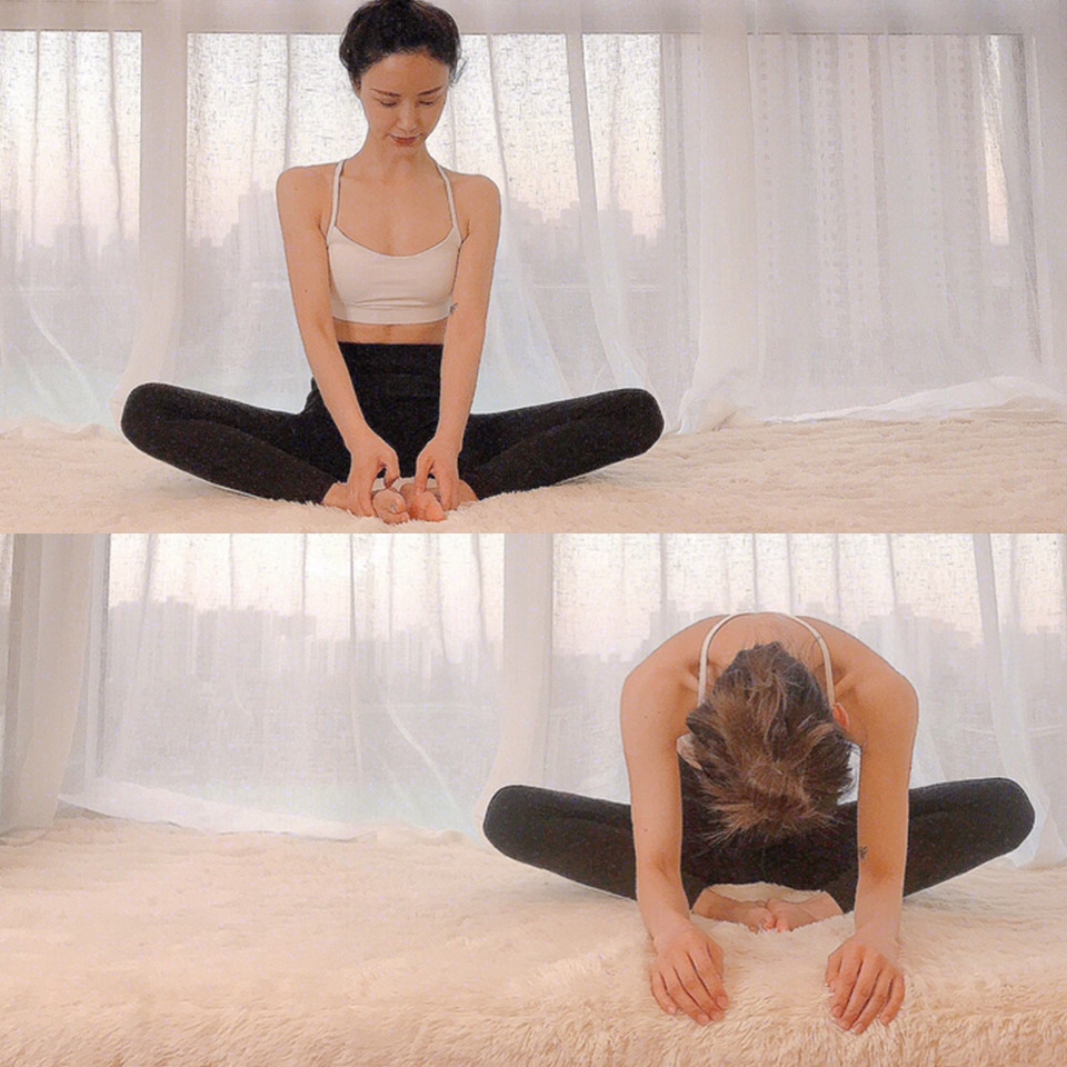 盤腿坐在地上將腳心並攏、膝蓋盡量往下壓,接著將上半身往前俯身,靜止停留1分鐘,這個動作可以基礎伸展整條腿內側。