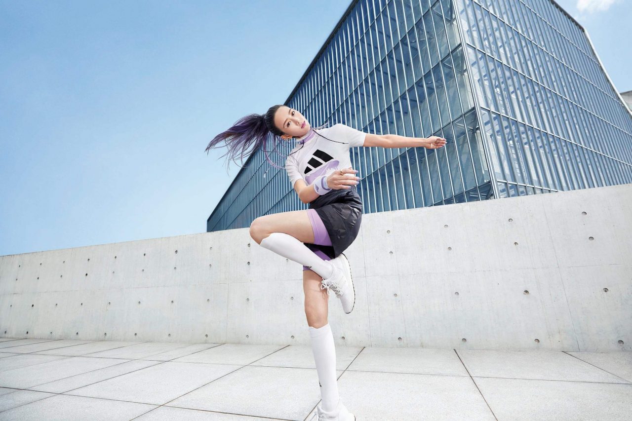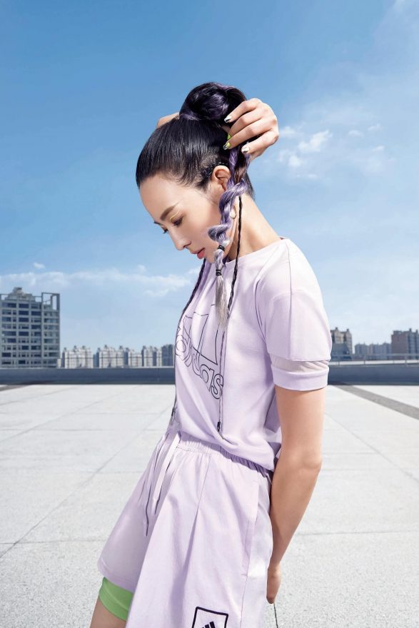 張鈞甯穿上 adidas 全新夏日城市逆襲系列服飾,主打款 T 恤粉嫩薰衣草紫色系襯膚顯白,袖口透膚拼接盡顯細節,下擺開衩設計,更適合運動時穿著。下身利用同色系褲裙呈現時下最 in 冷淡風「one tone」穿搭,主打款褲裙下擺打摺設計結合傘狀褲管,凸顯腰身同時顯瘦、修飾身形,整套穿搭打造逆天比例。另一套將經典白色 logo 上衣綴以浪漫紫色潑漆,下身搭配兼具機能與時尚的風褲材質短褲,活力女孩好感度瞬間爆棚。
