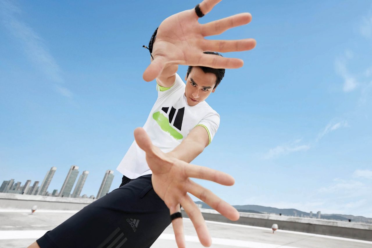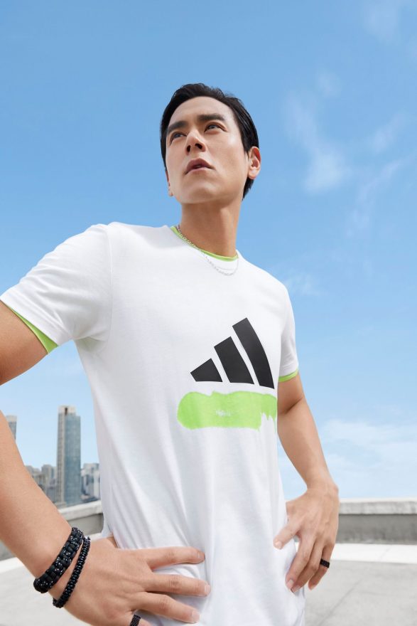 彭于晏身穿仙氣紫色主打款 T 恤,落肩拼接剪裁視覺修身,更舒適貼合亞洲男性身型。左胸口以指南針圖騰標註 adidas 全球 4 大設計中心:HZO(德國總部)、PDX(美國波特蘭分部)、SHA(中國上海分部)、TKY(日本東京分部),搭配全新附腰帶挺版黑色短褲,不費力成就最好駕馭夏日帥氣穿搭。另一套極簡白色 Logo T 恤格外搶鏡,胸前一抹螢光綠潑漆,為經典 Logo T 恤增添變化與趣味風格。下身以潮流窄版黑色運動短褲,成功展演城市街頭時尚率性。