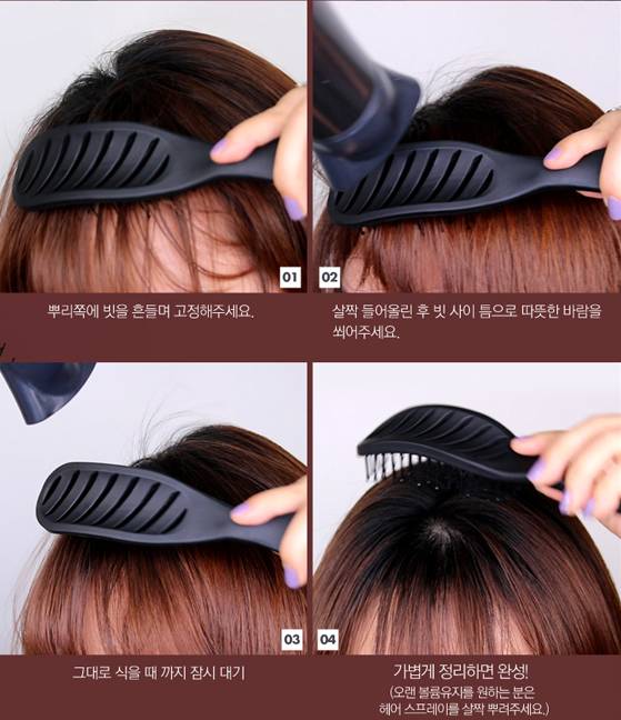 將梳子固定在髮根處,利用特殊通風孔讓熱風吹入髮根處,將空氣注入髮根與秀髮之間,製造自然蓬鬆效果。