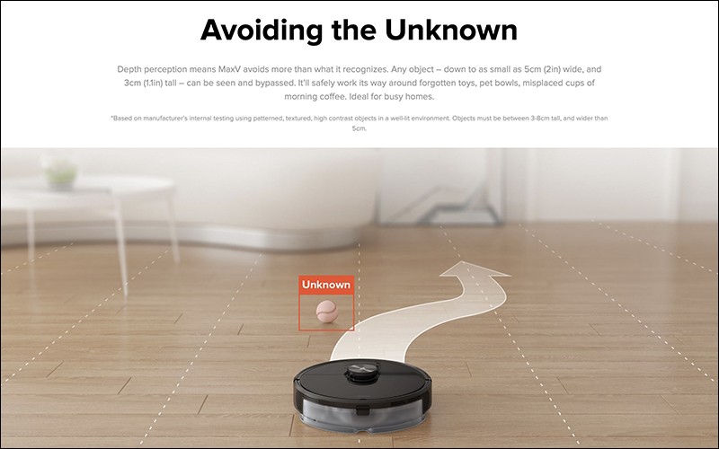 深度感知意味著 S6 MaxV 也可避開超出其識別範圍的事情,可辨識寬的小至 5cm 、高度小至 3 cm 的物品並避開: