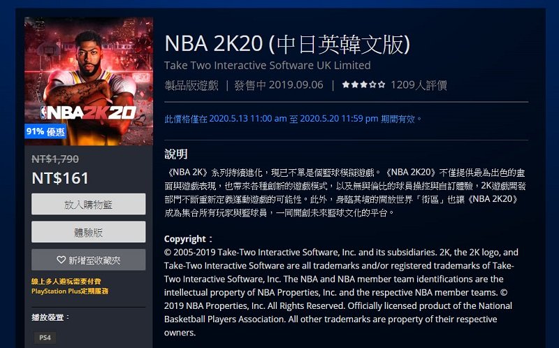 目前《NBA 2K20》 (中日英韓文版)於PS Store上,從2020.5.13 11:00 am 至 2020.5.20 11:59 pm,提供了91%的優惠折扣,由原價1790元變為161元。