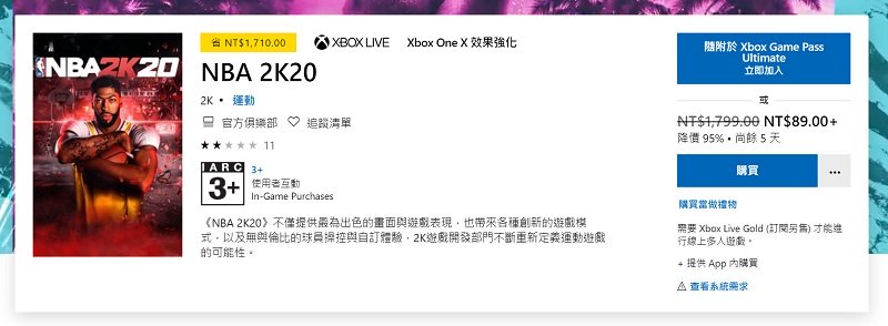 《NBA 2K20》則於XBOX ONE X 提供5天的95%優惠折扣,由原價1790元變為89元。