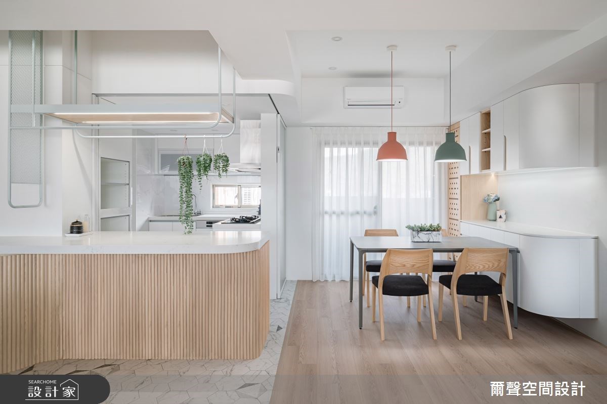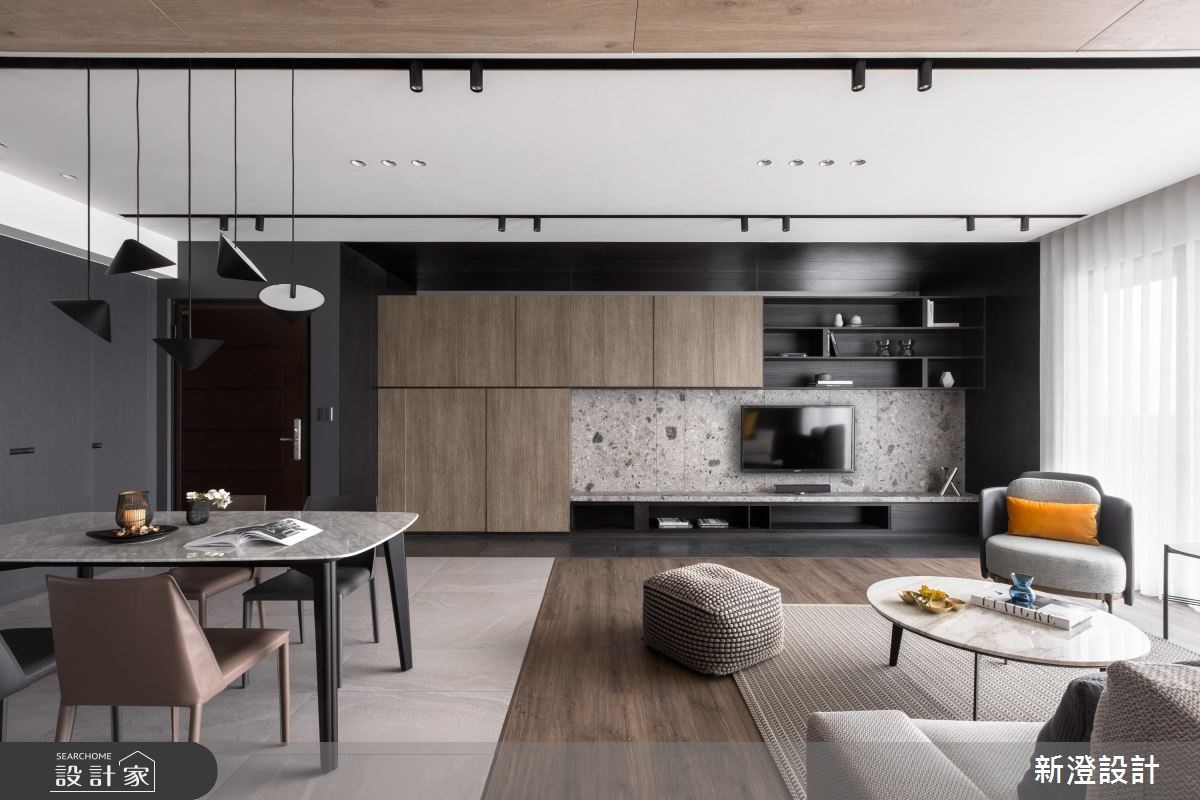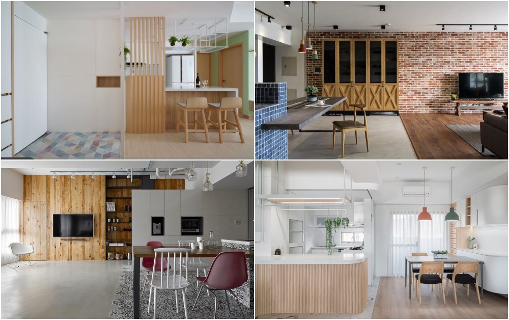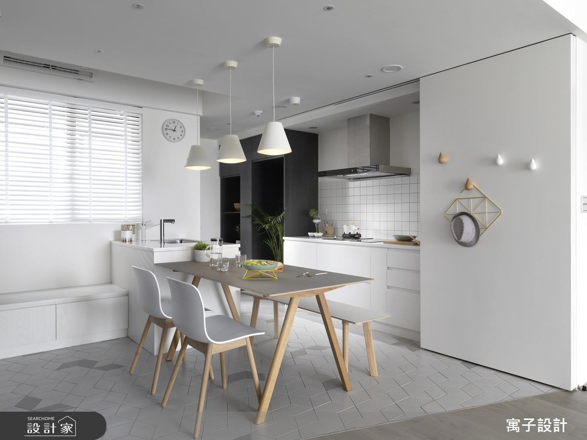 傳統居家設計裡,客廳與廚房常常是由隔間區隔開來,但隨著生活習慣的歐美化加上坪數的限縮下,大部分公共區域都將實牆拿掉採取開放式設計,爭取更寬敞的視覺感受,也優化空間動線。在客廳與餐廚空間的分隔材質上也很多選擇,通常會將放鬆用的客廳區鋪陳木地板,而比較需要考慮到機能面的餐廚地板用磁磚或水泥粉光打造。除此之外,也能透過不同紋理與色澤的木地板拼接,劃分生活場域。