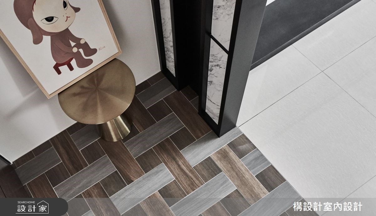 玄關雖然在居家空間佔比相對小,但卻是扮演生活裡十分重要的場域。被稱為落塵區的玄關,主要機能就是提供進家門後可以脫鞋並收納的區域,避免外面的灰塵泥沙直接帶到室內空間。透過不同地面材質的轉換能夠不著痕跡的劃分場域,拼接手法也各有變化,花磚、木地板、磁磚、石材、清水模等等異材質結合並因不同施作工法創造空間風格,可不是只有線性拼接唷!