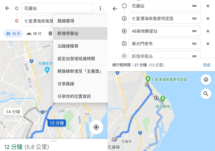 安排旅遊景點超簡單!只要把想去的景點列出來在Google Maps上新增停靠的地點,這樣就可以輕鬆安排旅遊路線!開車時也就可以依序前往,並且計算如何排序比較順,以及了解整個路程時間~