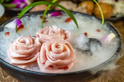 「丹麥國寶A級松阪豬」外型纏繞成玫瑰狀的松阪豬,不僅品嚐起來Q彈有勁,頂級肉品絕對是不吃牛肉者的必點第一名!