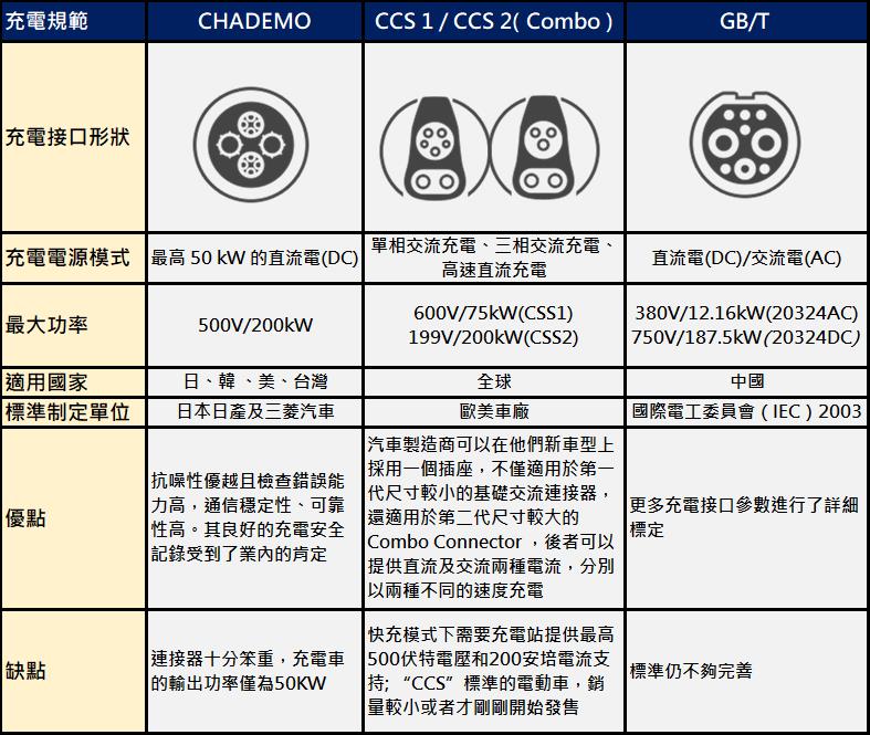 目前全球(純)電動車的充電規格並不相同,主要可以分成美規(SAE J1772)、歐規( IEC 62196)、中國(CB/T)、日規(CHAdeMO)及Tesla專有規格,台灣則採用美規。