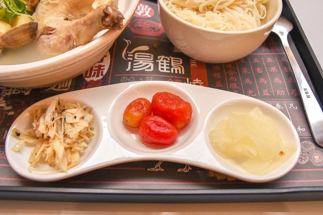 涼拌牛蒡絲爽脆,鹽漬番茄酸甜解膩,醃製蘿蔔醋溜薄脆,搭配雞湯享用增添風味
