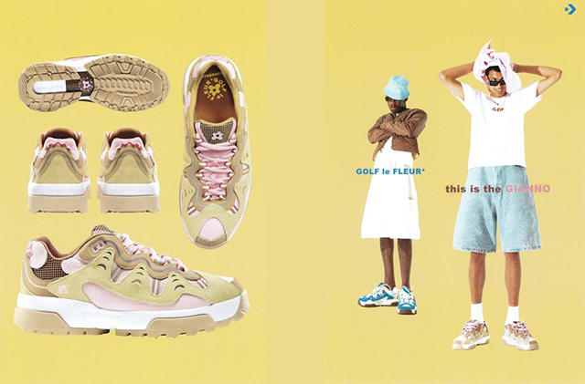 2019年「Converse x GOLF le FLEUR*」推出了全新聯乘鞋履”Gianno”, Tyler以自身熱愛的BMX單車與徒步運動為靈感,融合跑鞋、籃球鞋等復古鞋型的元素,創作了這雙帶有機能感的時尚鞋款,鞋面以皮革、麂皮、網眼布面等多種材質拼接成,淺粉與天藍的配色更賦予了這雙鞋活力,喜歡復古潮流的你絕不能錯過!