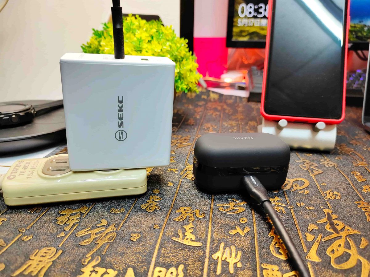 耳機搭配充電艙最高可以連續使用55小時,相當於連續配戴兩天以上的時間。筆者習慣在充電艙剩下一顆LED燈時開始充電。只要使用一般的充電器搭配 USB-C 充電線,插上充電艙之後即可開始充電。充電的時間相當快速,一旦電量足夠之後,耳機放入充電艙便會開始充電。
