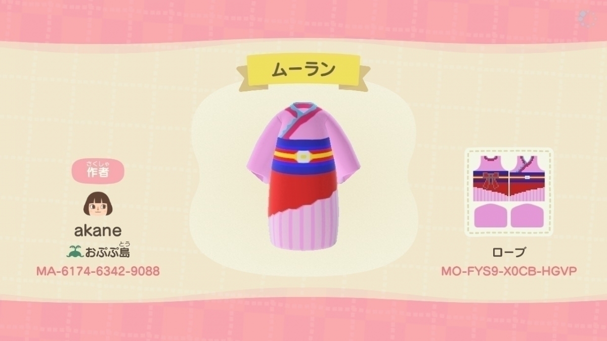 花木蘭的服裝像是將和服與洋裝組合而成,鮮豔的粉紅色充分展現出花木蘭的堅強氣質。
