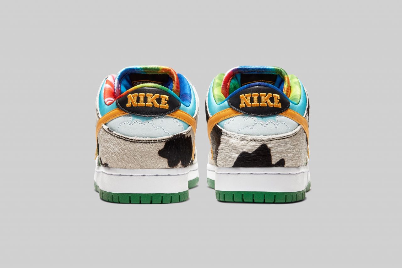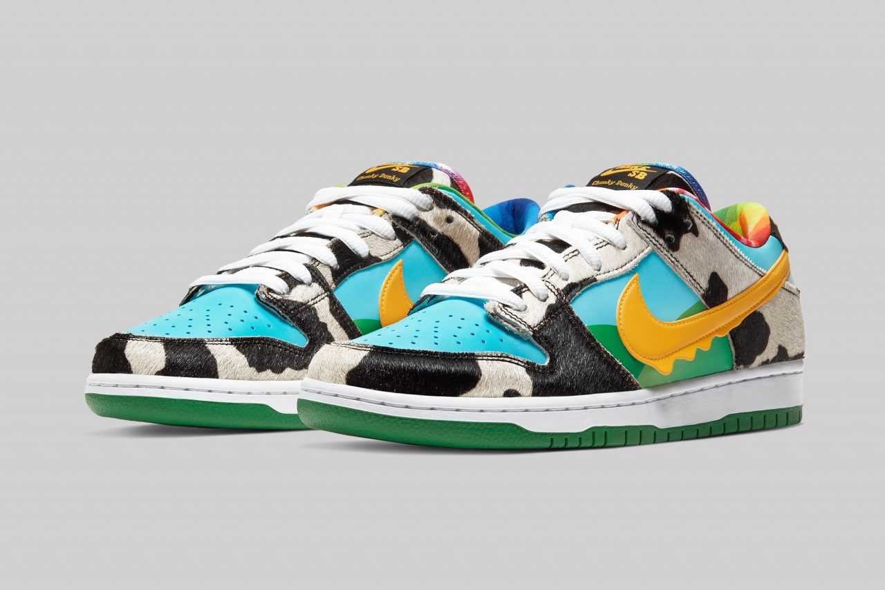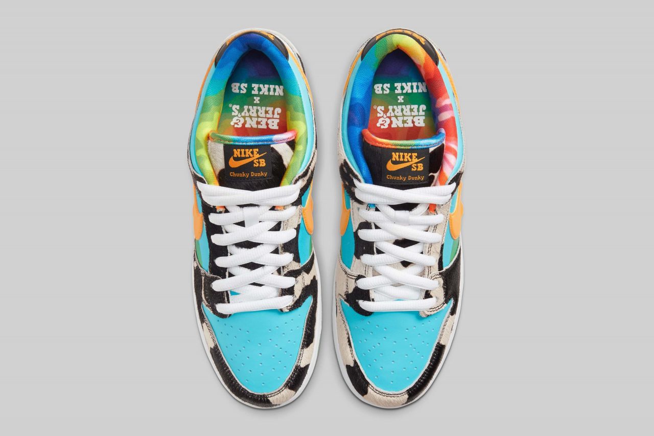 Nike SB Dunk Low Pro ‘Chunky Chunky’ 鞋面設計源自 Ben & Jerry’s 冰淇淋的經典包裝,藍天、綠地、乳牛都以不同意象出現在鞋款上,其中乳牛還特別換上了人造毛材質,詼諧有趣的設計不僅反映出了 Ben & Jerry’s 的招牌,也符合 Nike SB 系列特有的街頭風格。