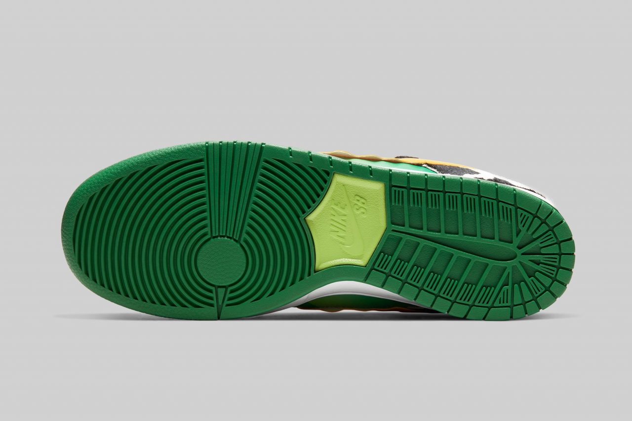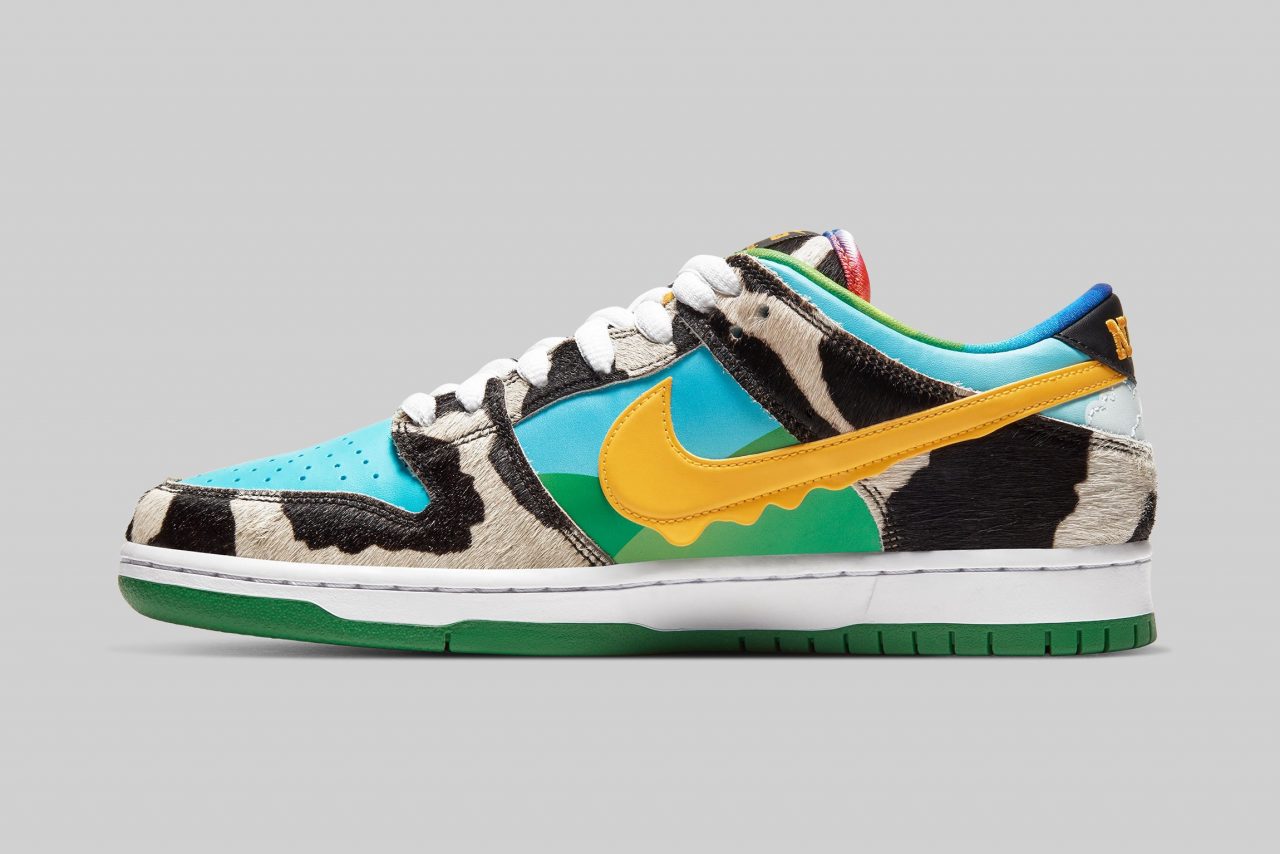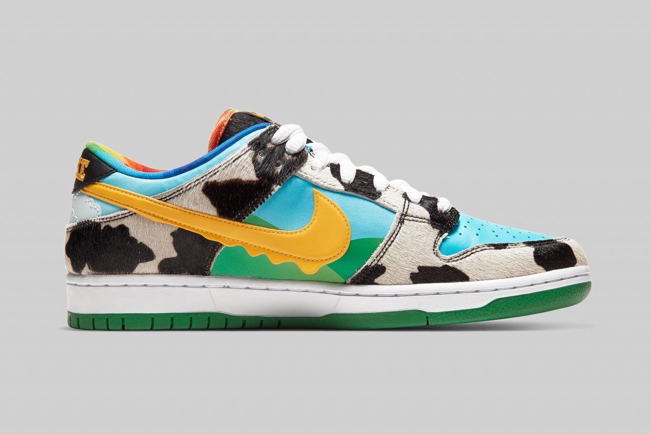 Nike SB Dunk Low Pro ‘Chunky Chunky’ 鞋面設計源自 Ben & Jerry’s 冰淇淋的經典包裝,藍天、綠地、乳牛都以不同意象出現在鞋款上,其中乳牛還特別換上了人造毛材質,詼諧有趣的設計不僅反映出了 Ben & Jerry’s 的招牌,也符合 Nike SB 系列特有的街頭風格。