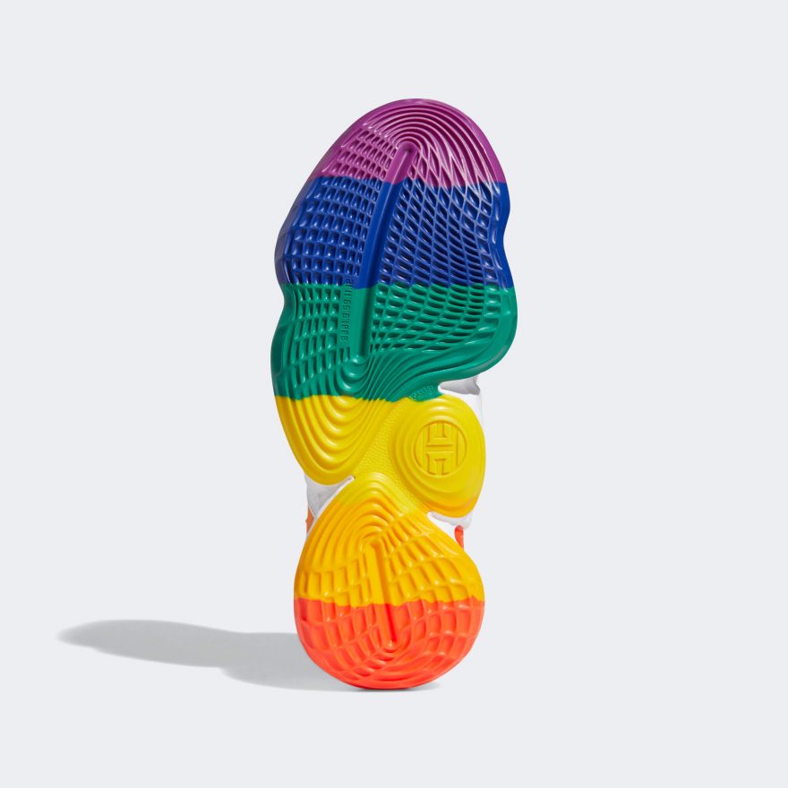 adidas Harden Vol.4 因為本身鞋面結構本來就有區域性的材質差異與堆疊,所以可以發現在最主體的鞋面是以彩虹選染的方式呈現,而在鞋頭與中段同材質的地方則以全白搭配,在顯眼之中更加入了純淨的概念。而鞋底也與鞋面呼應,把彩虹旗分段處理呈現在鞋底。