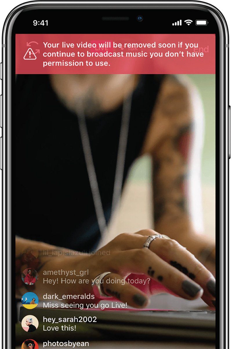 如果影片內所使用的音樂被判定侵權,該公司將改變向用戶發送通知的方式,直播與影片中會提前出現一條警告,提醒用戶注意任何違規行為,這是為了幫助用戶通過調整直播影片和刪除未授權的配樂來避免自動中斷機制。如果 Instagram 檢測到影片中包含未授權音樂並接近其限制,系統會以靜音或屏蔽的形式來處理,上傳者會看到站方提供的建議補救步驟。