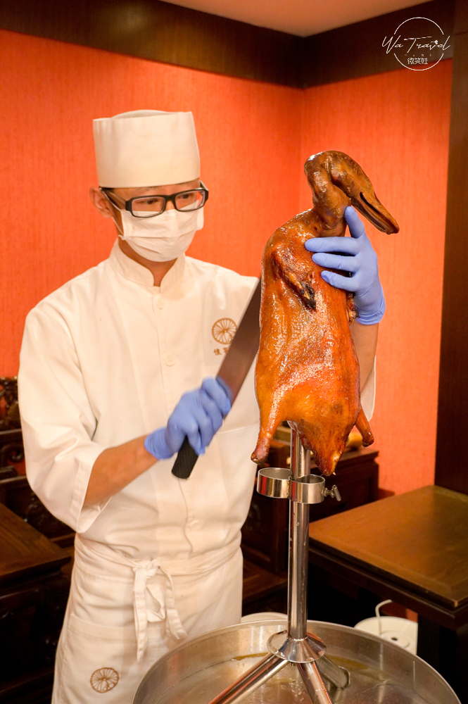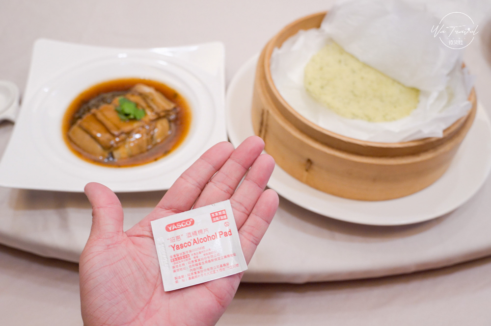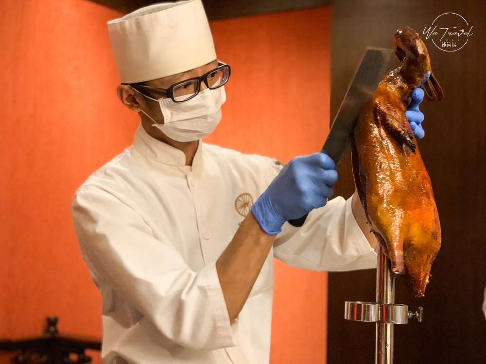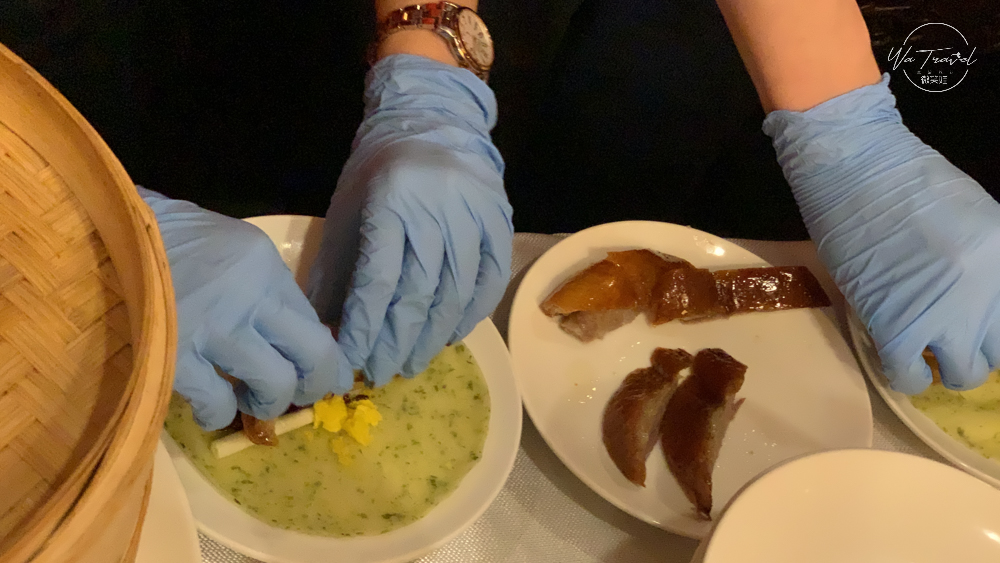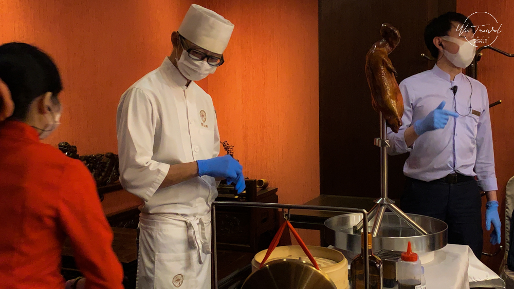 主廚在片鴨時,更是直立式片鴨,可以直接看到主廚的好刀工、好功夫,在上菜前桌邊服務人員貼心準備酒精棉片,讓賓客可以用來擦拭雙手,相當貼心。