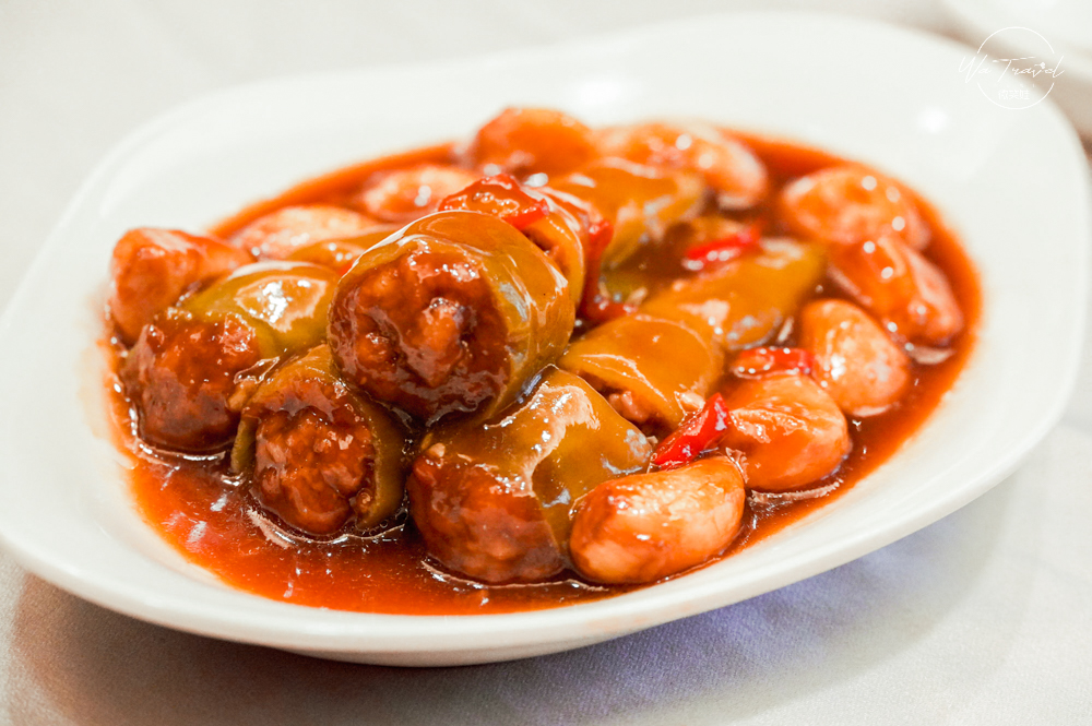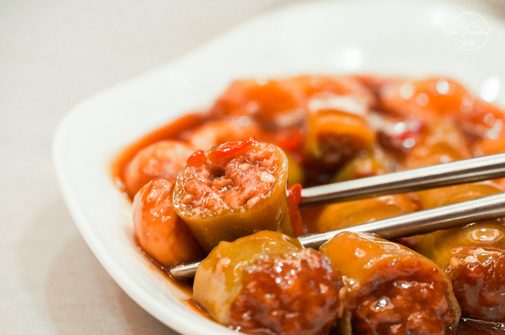 鑲韭菜椒(糯米椒)口感帶一點點的微辣,糯米椒特殊的脆度口感,入口後口感綿細肉末札實,連帶辣椒的微微辣香搭配肉餡的自然甜味,蒜香與外層的油香,讓整道料理吃起來風味十足,也可以看到這道菜細膩的製作手法。