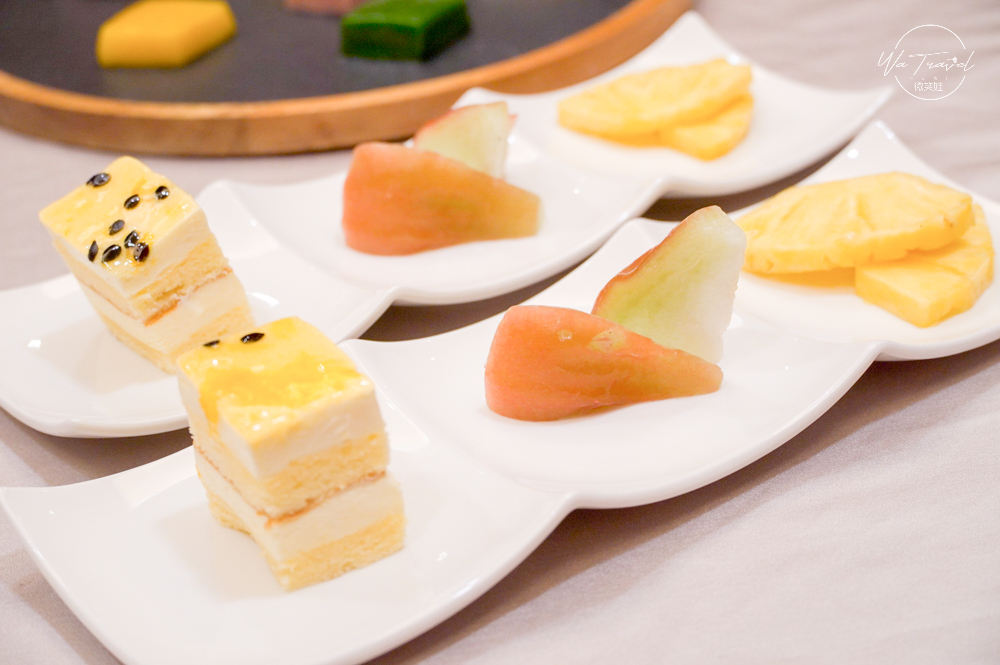 甜點鮮果盤有百香果慕斯蛋糕跟當季水果,這次搭配的是蓮霧還有鳳梨