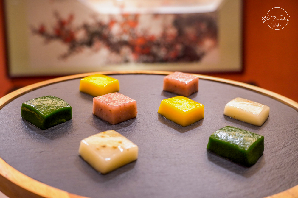 「黏筷、黏盤、不黏牙」的新奇甜點,桂花、芒果、草莓、抹茶,這是第一次看到特殊的拉糕甜點,倒著也不會掉下盤子,吃入口濃郁的水果香氣跟茶香,一點也不黏牙,來到點水樓必點