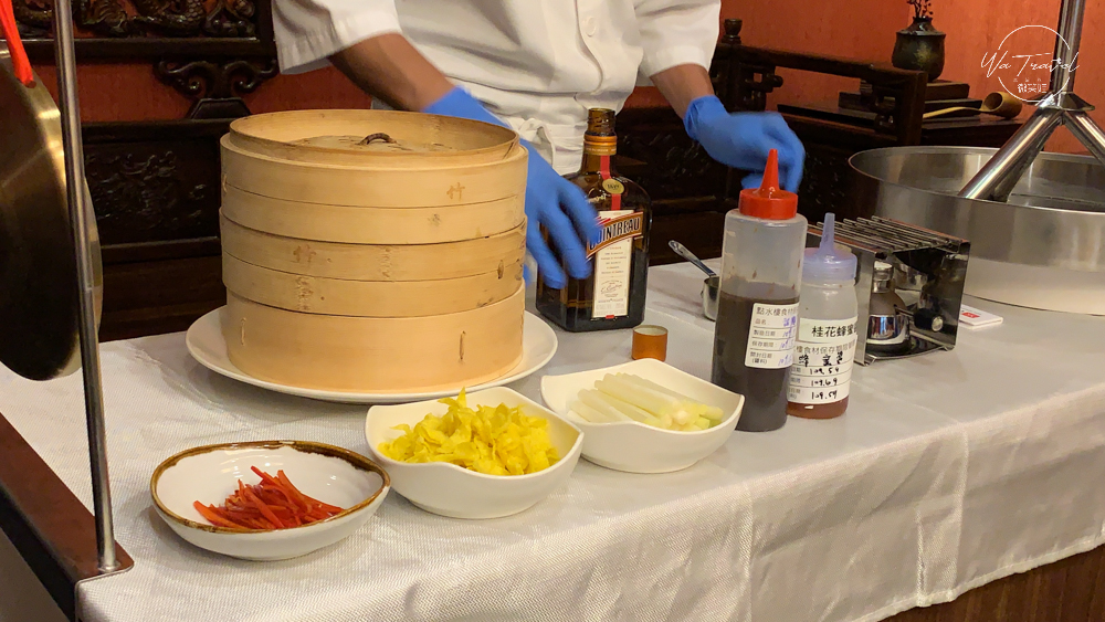 火焰鴨搭配的是自製的Q薄餅皮,搭配宜蘭三星蔥、黃皮、辣椒絲跟兩種醬料來吃,第一次吃到桂花釀醬搭配烤鴨,點水樓真的給我超乎想像的驚喜,帶著輕輕的桂花香甜,讓皮脆的烤鴨充滿甜而不膩的滋味,在吃甜麵醬口味,多帶了鹹度的甜麵醬口味特別的還是那脆度口感十足的片鴨,太讓人回味無窮。