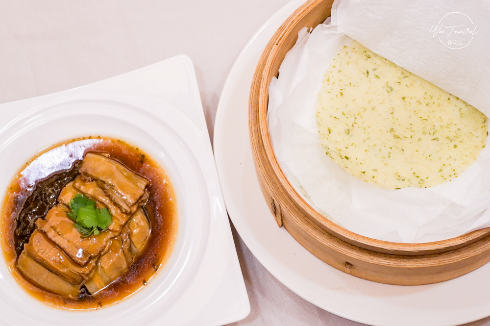點水樓的梅干菜扣肉切成一片片薄片肉鋪滿在自製的梅干菜上頭,讓醬汁包覆整個梅干菜香氣,肉質相當軟嫩咬一口就滑入口中,也可以將其搭配荷葉餅皮中一起吃,添加另一種吃法,單吃每吃一口都覺得相當下飯,搭配餅皮吃多一種滿足感。