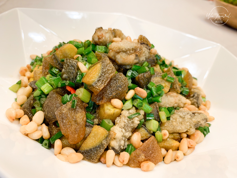 點水樓是僅採用「嘉義東石」的鮮蚵製作此道料理,鮮蚵加入皮蛋一起油炸後,拌上大量的韭菜花丁和炒香的松子,讓整道菜增加鮮甜口感,是一道很特別的料理,皮蛋因為經過油炸,完全不會有軟嫩的感覺,反讓皮蛋多了Q度,沒有蛋腥味。