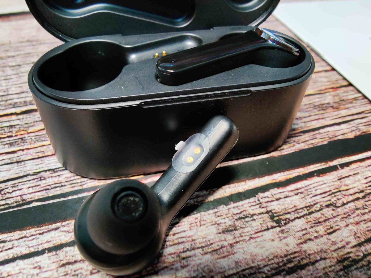 「 Funcl AI 」在耳機端有兩個金屬端點,充電艙中有兩個金屬針點,將耳機放入後即可使用磁吸充電。耳機充電艙大約能提供 24 小時的電力,耳機單次使用最高能使用約 6.5 小時,在開啟 aptX 模式下,大約能使用約 5 個小時,續航表現上屬於中上等級。