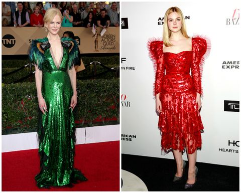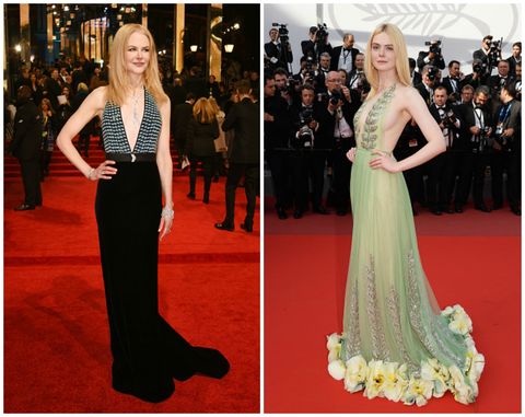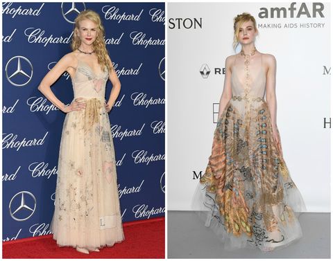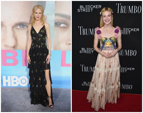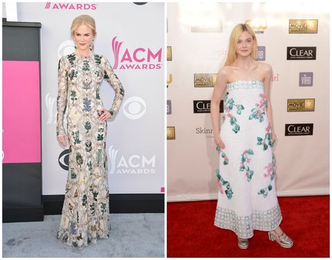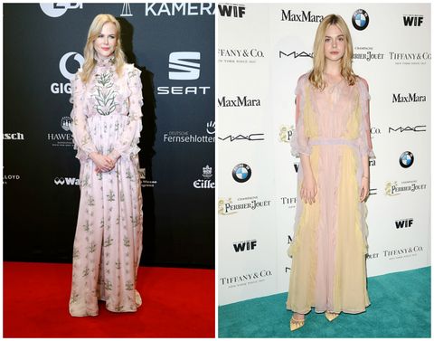 妮可基嫚的Giambattista Valli花朵長裙,襯托出了她的高雅仙氣,高領荷葉邊與粉紫色雙雙傳達出柔美飄逸的浪漫感,艾兒芬妮的Valentino粉彩紗裙則多了一些少女的清甜氣息,兩人皆宛如踏步於花園的仙女,溫柔恬靜。