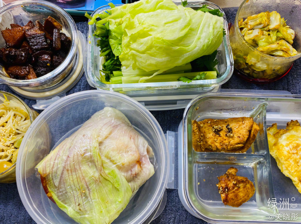 準備材料上,除了大片生菜和保鮮膜是必備,其他可以根據喜歡的食材和口感考量做調整。好比說番茄和雞蛋放一起,不論是冷或是熟食都非常合拍,而小黃瓜或是紅蘿蔔可以增加口感。
