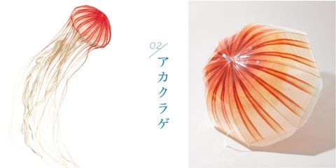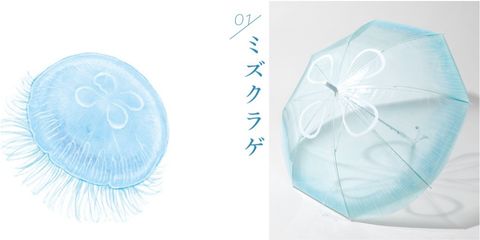 第一款是以水藍色的「月海水母」為靈感,月海水母表面上帶著細細的白色花紋,Felissimo為高度還原月海水母的柔和的輪廓,將雨傘的邊緣設計為圓弧、飄逸的樣式。