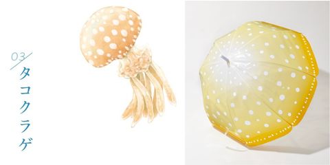 最後一款水母雨傘則是參考看起來相當活潑的「珍珠水母」,溫暖的太陽黃為底色,上面佈滿著大大小小的圓形斑點,在憂鬱的雨天撐著如此可愛的雨傘絕對超吸睛!