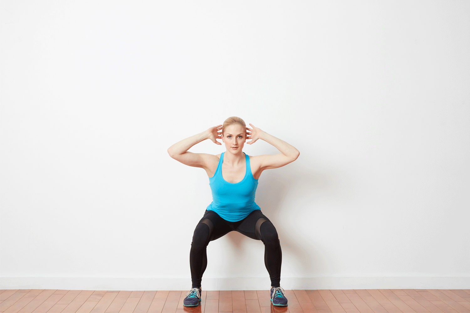 新手可以在屁股後面放張椅子,方便找到正確的蹲坐姿勢。進階者則可以手抱啞鈴(或是滿水水壺)增加附重,讓瘦身更有感。