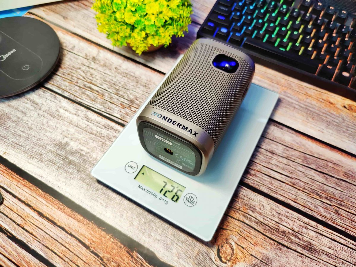 「 微型投影機 」,從命名上來看微型注定必須有著極輕巧的重量與便攜的外型。經過筆者實際測試,WONDERMAX AP7 投影機 重量大約 726 克,與遙控器一同攜帶也僅只有 754 克。筆者認為同時具備喇叭及內建電池的 AP7,重量上控制得相當得宜。