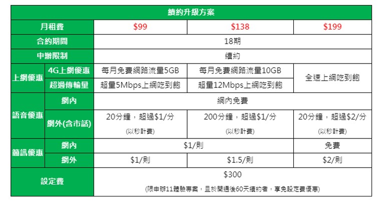 再者,「11元新戶續約體驗相挺方案」月付11元享1GB不限速上網只有優惠六個月,該方案開通60天內,亞太電信提供99元/138元/199元三款超值續約方案,免300元設定費,最高享不限速上網吃到飽、200分鐘語音通話數。