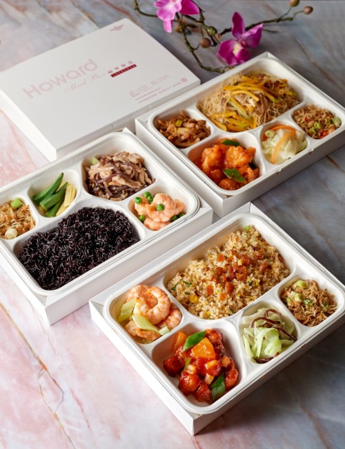 蓬萊邨(左)紫米養生飯餐盒(下)烏魚子炒飯餐盒(右上)金瓜炒米粉餐盒 vic:台北福華