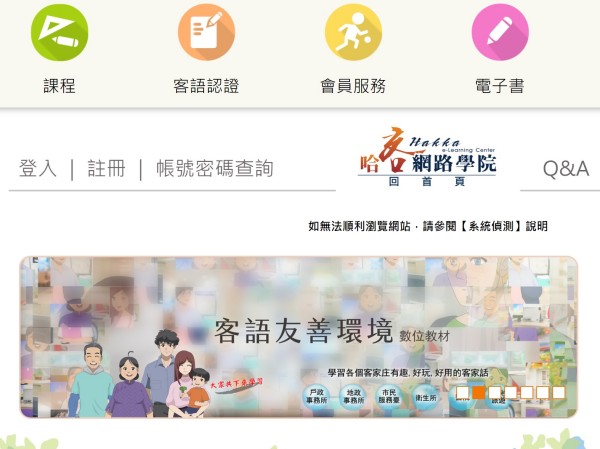 客家委員會為推廣客家語言文化,開發的線上多媒體語言文化數位課程,有「客語能力認證考試基本詞彙」100年新版、「客家話的趣味」、「客語話摩登」等課程,讓客語的趣味與奧妙透過情境動畫生動呈現!