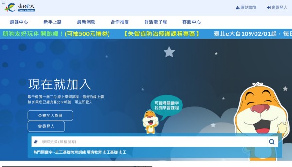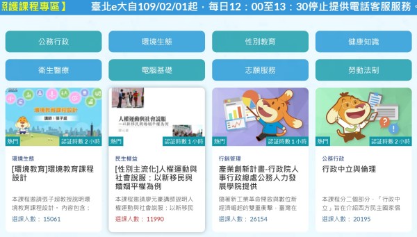 是臺北市政府主辦的數位學習網,教材類型持續豐富,從個人理財、志工訓練、手工技能等學習服務不斷創新,以學習資源整合、共用、共享角度,運用網路數位科技,提供臺北市政府員工與一般民眾,線上與實體課程整合的終身學習環境。