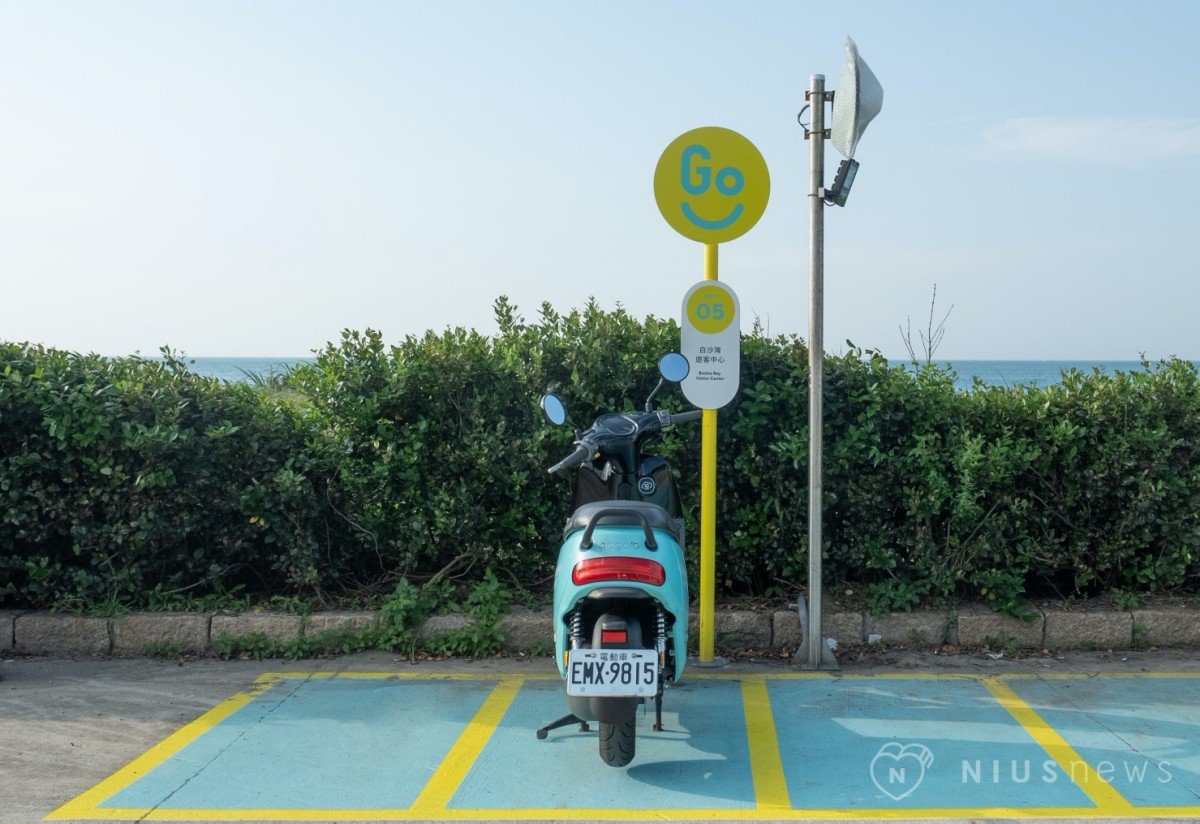 意思就是妞妞們只能在GoShare DOTS設置的11個站點的專屬停車格內才能借、還車,每個站點都設置了像棒棒糖一樣的站牌,還有黃藍相間的停車格,可愛爆表又顯眼,完全不擔心會找不到。而站點間都設有GoStation電池交換站,完全不怕騎到一半沒電喔!