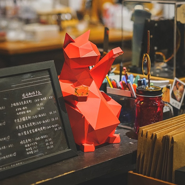 前衛的紅色招財貓除了妝點有時尚工業風的居家佈置之外,紅色的招財貓還代表身體健康的意思。