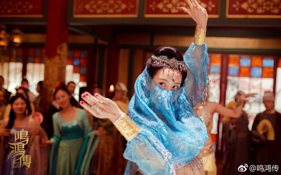 在《班淑傳奇》飾演樓蘭王女安心,也少不了跳舞名場面,戴上異域風情的頭飾,即使誇張的頭飾在她身上好像也很合理。