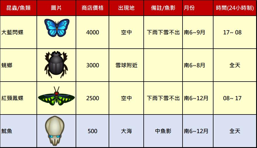 6月份南半球新增三款昆蟲及魷魚,其中較有價值為大藍閃蝶($4000)及蜣螂($3000)。