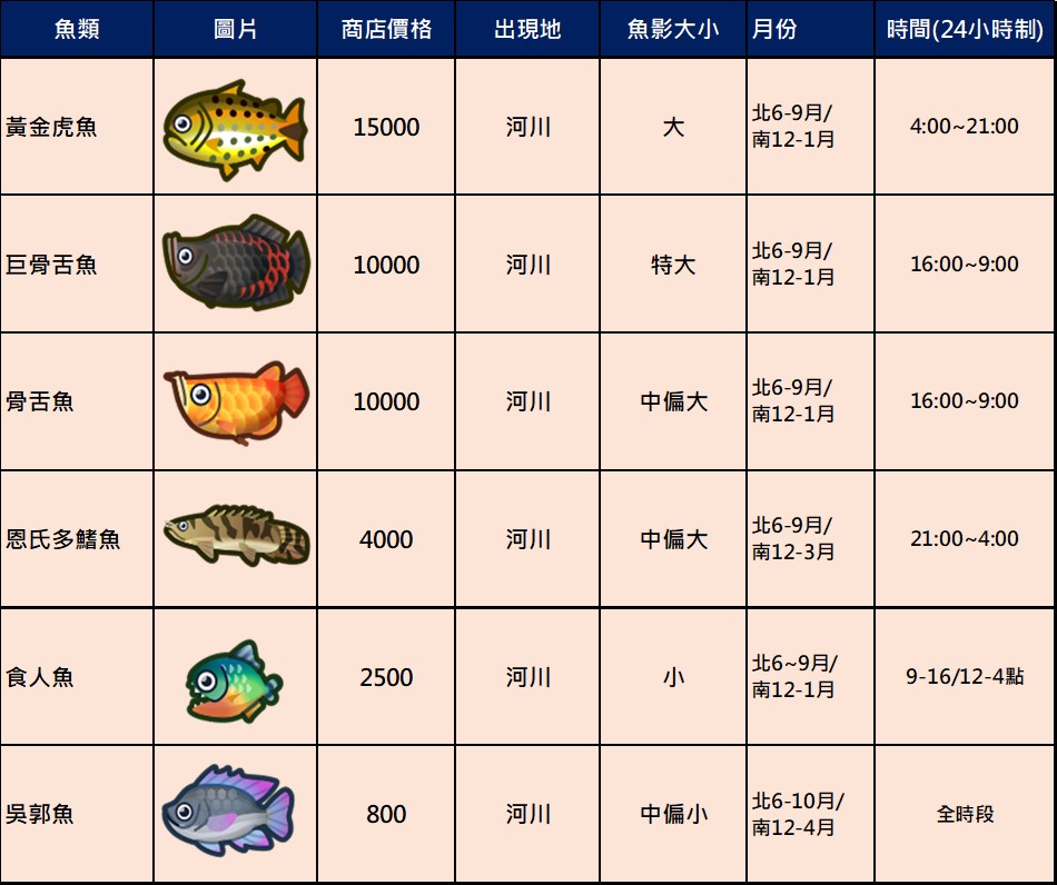 六月份北半球將會在大海新增6款魚種、池塘兩種、河川六種。其中,最受矚目的大海中的魚影為背鰭的鯊魚系列、河川高價大魚(黃金虎魚/巨骨舌魚/骨舌魚…)及池塘的雀鱔與鱧魚(黑魚)。