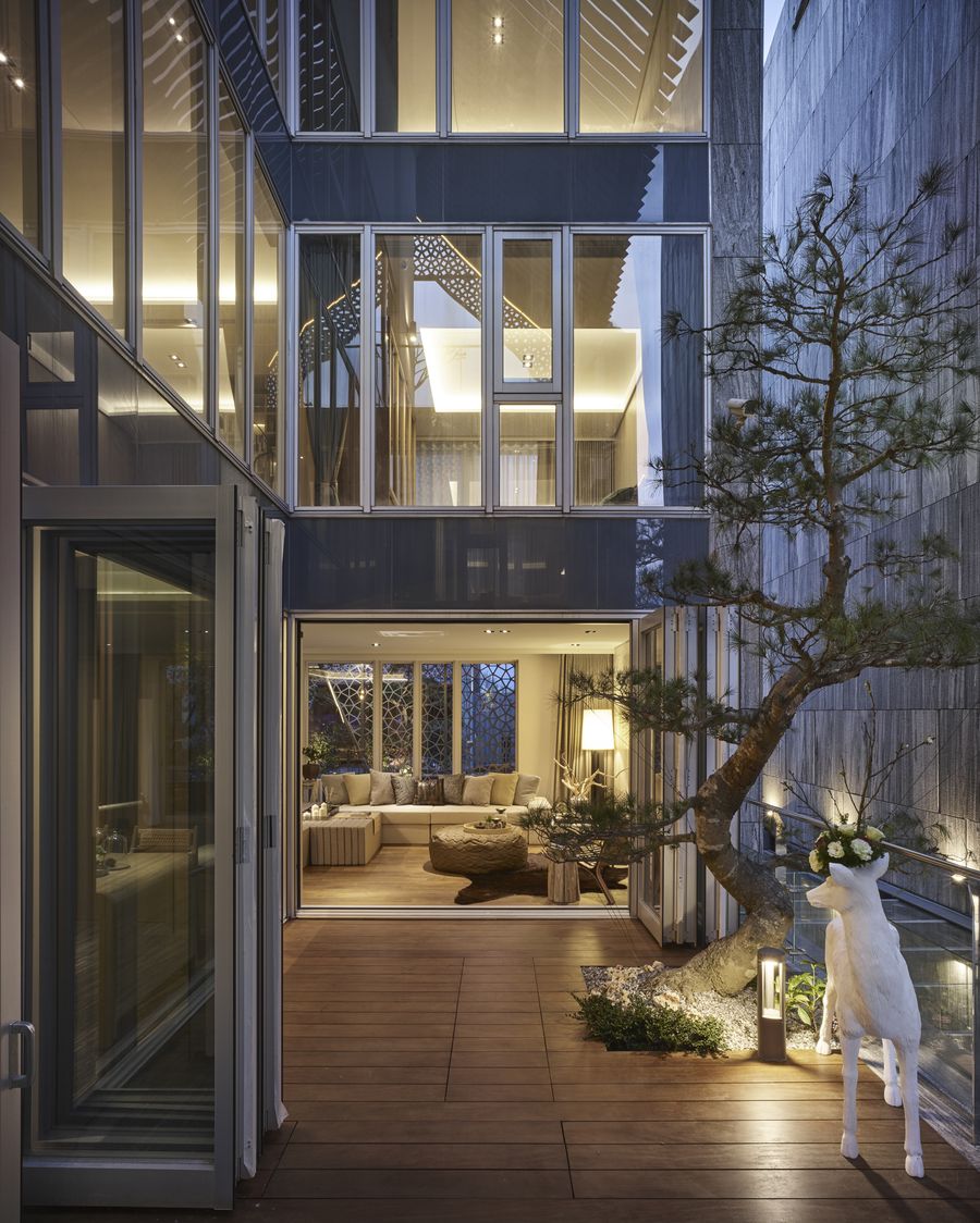 本案位於新北市林口特定區,工商發達而區域特質鮮明。基地位於純住宅區內,周邊皆為三、四樓透天別墅,西北方臨八米計畫道路,東南方為區域邊緣,地勢轉下直至山坳谷底,綠意一路延伸至視覺的彼端。透過環境回應決定主要立面材料,從地而上,於地板鋪面至建築表層均以山水花崗岩作為主要基石,以造山回應山巔,形成住宅與自然比鄰的環境優勢。