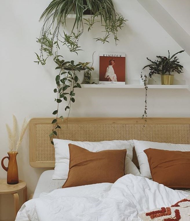 佈置清單:垂墜的植栽搭配 #藤製的床頭板、#藤色寢具,空間更顯自在休閒