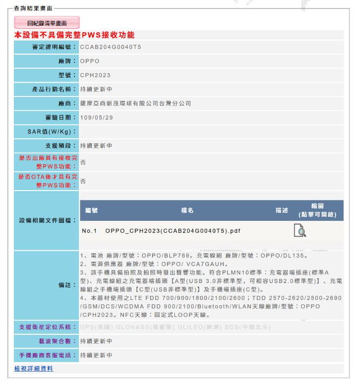 OPPO Find X2 Pro (CPH2025) NCC 認證頁面