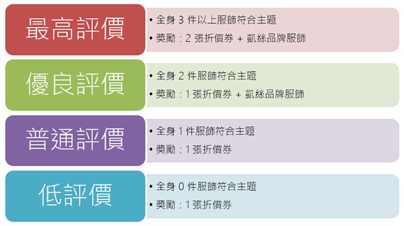 時尚考試所獲得的評價越高,你就會獲得越多獎勵;評價部分則根據你所搭配的全身行頭適配性來判斷。評價共有 4 個等級,筆者下方也整理出評價標準與各自的獎勵來供大家參考: