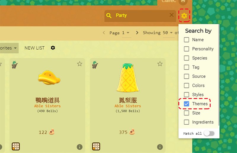 另一個搜尋方法,就是可以在右上角的搜尋欄位旁邊的齒輪上點一下,將搜尋的目標設定為「Themes」,就能直接複製上面筆者提供的英文來搜尋符合主題的服裝與配件。